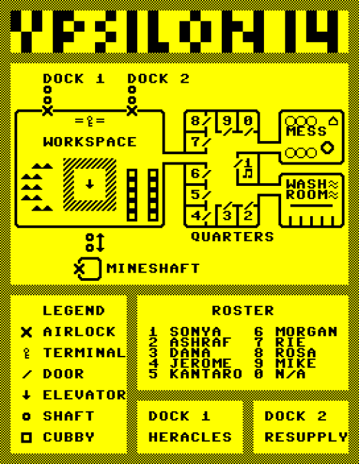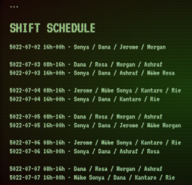 When they arrived, Sonya spilled the beans: Mike was missing. She asked the Crew to investigate because Y14 has quotas to keep. To make Y14 feel like a lived in, moving space, I made a shift schedule. Sonya had to leave to replace Mike as Mining Engineer.